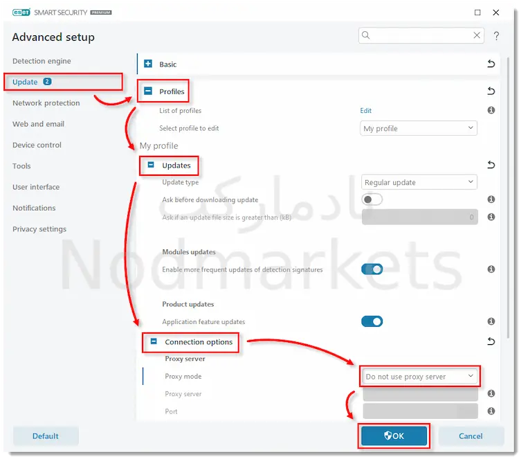 3. روی Update کلیک کنید، Profiles → Updates → Connection Options را گسترش دهید. از منوی کشویی حالت Proxy گزینه Do not use proxy server را انتخاب کرده و روی OK کلیک کنید.
